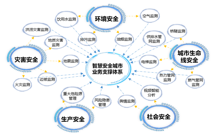 “智慧安全城市”体系由一个平台、一个顶层应用、七大支撑板块构成。基于大数据/人工智能/物联网等前沿技术,建设高度智慧化的统一平台,顺利获得数据融合、业务融合、技术融合,突破城市应急管理能力提升的壁垒,解决信息孤岛、全局协同与智能决策等关键问题。